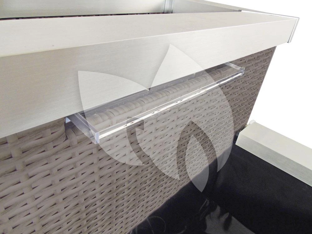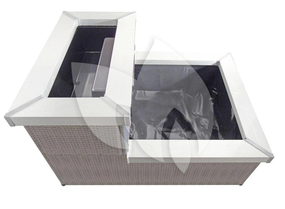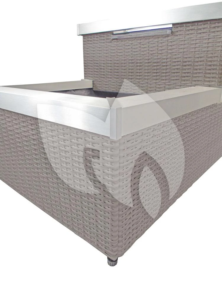 De minivijver heeft een grijs-beige, kunststof wand en is afgezet met een aluminium rand. Deze materialen geven de terrasvijver een moderne uitstraling welke een aanwinst is voor ieder terras. Het gevlochten kunststof, ook wel wicker genoemd, is onderhoudsvrij en weerbestendig waardoor u jarenlang kunt genieten van de minivijver.