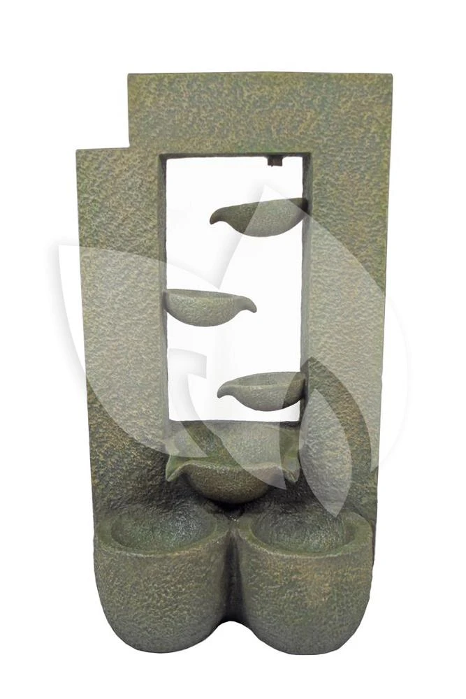 Modern en rustiek ontmoeten elkaar in dit mooie waterornament. In een strak vormgegeven kader loopt water via verschillende schaaltjes naar beneden. Vanuit het onderste schaaltje loopt het water het reservoir in waarna het weer omhoog gepompt zal worden. Een heerlijk rustgevend tafereel op uw terras!