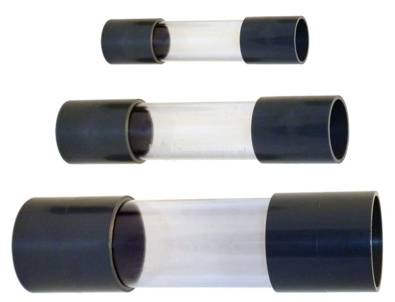 Hoogwaardig zichtglas van PVC. Dit zichtglas kan bijvoorbeeld gelijmd worden tussen twee PVC-buizen.